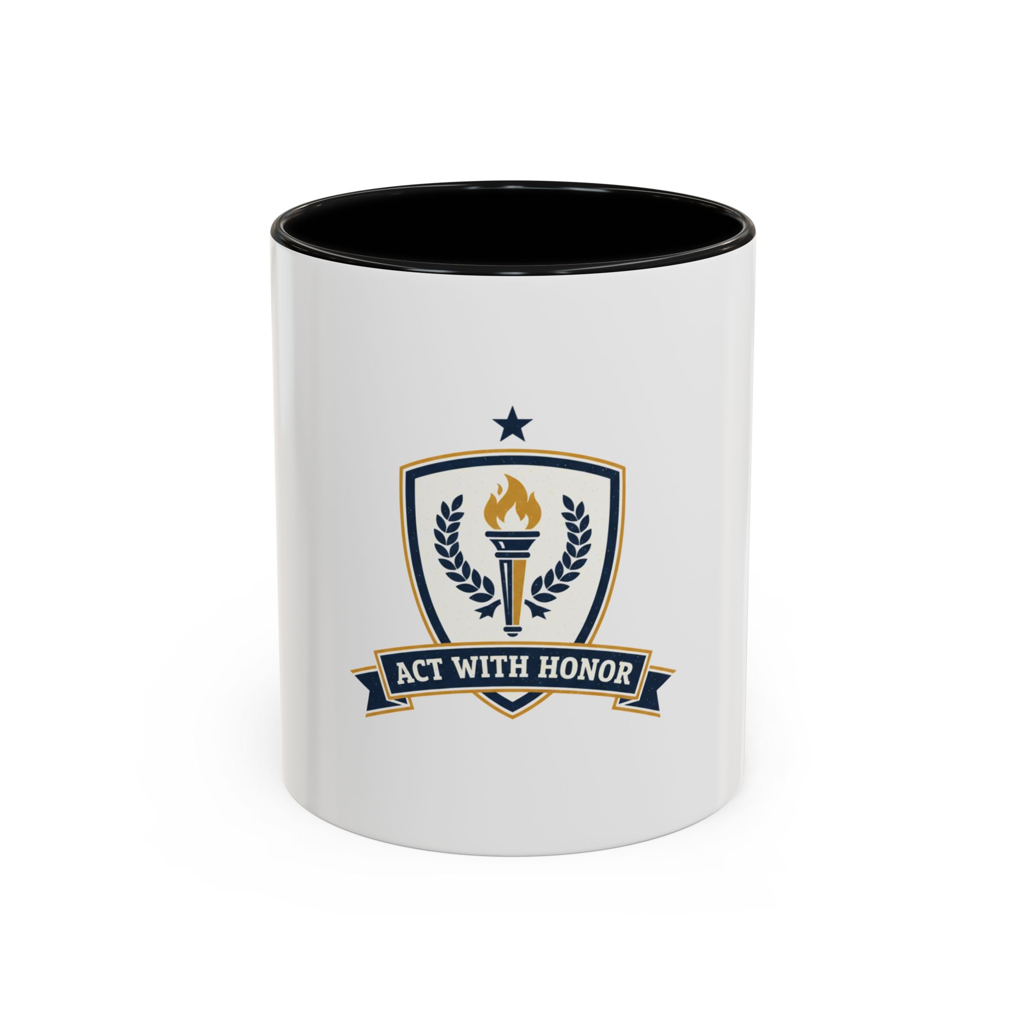 A clean, confident ceramic mug that carries a quiet code: Act With Honor. The shield-and-torch emblem, rendered in deep navy and warm gold against a crisp white face, brings a collegiate, ceremonial energy to morning routines. Its colored interior and handle add a tasteful contrast while the glossy finish keeps the lines sharp and the colors lively. This mug settles into the hands of someone who values integrity and visible reminders of their principles — use it at the kitchen table, on your office desk, or beside a study stack. It feels steady during early planning sessions, and composed during reflective breaks, offering a small but steady ritual: a sip, a breath, and a return to what matters.