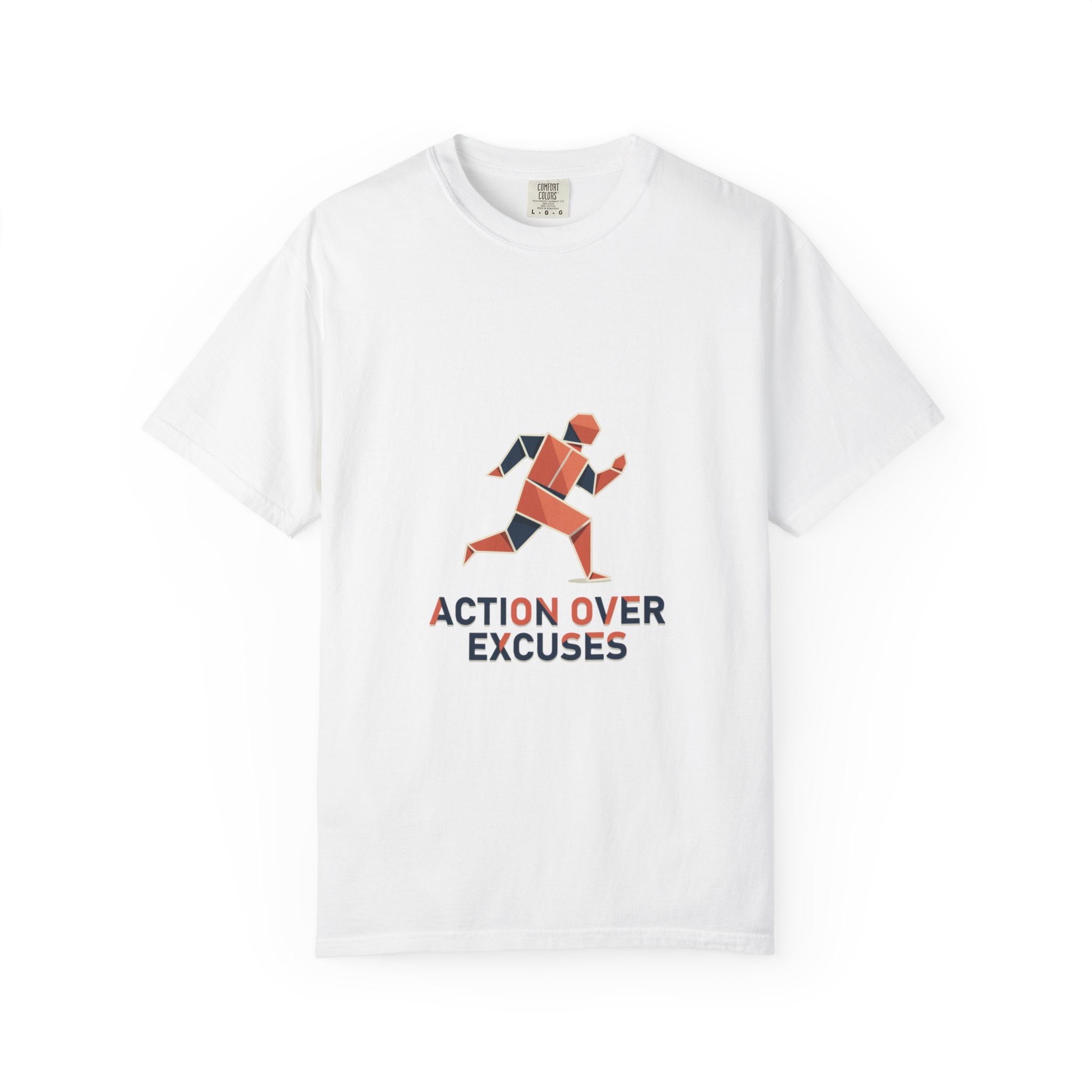 A lived-in, heavyweight tee that carries a quiet challenge on its chest. The soft, garment-dyed cotton feels broken-in from the first wear, while the relaxed cut lets you move without thinking about it. Front artwork shows a geometric runner mid-stride with the words “ACTION OVER EXCUSES” — a small, steady reminder to choose momentum over hesitation. Wear it after a morning run, on the way to the gym, or while tackling a project at home. The muted, washed colorways pair easily with worn denim or joggers, and the durable double-needle stitching and tubular construction mean this shirt holds its shape wash after wash. Sizes run S–4XL.