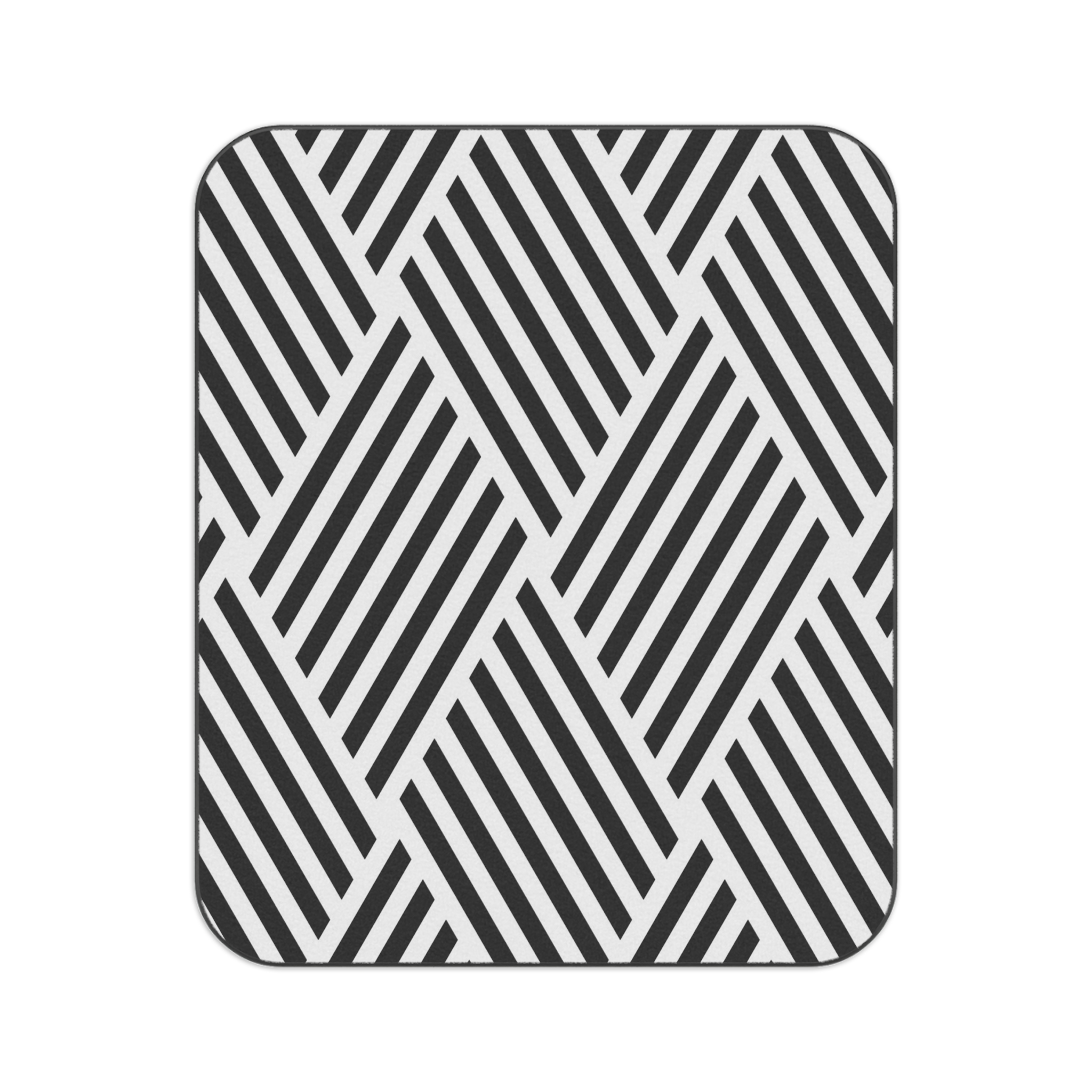 A lightweight, weather-ready picnic blanket that blends modern graphic style with practical design. The fleece top feels plush under bare skin, while the black water-resistant oxford backing keeps damp grass and sandy shores at bay. Neat sewn edges and a secure carrying strap with buckles make it easy to fold, carry, and store. The bold, high-contrast geometric print stays vivid wash after wash — a striking backdrop for coffee at sunrise, a quiet reading afternoon, or a sunset beach spread.