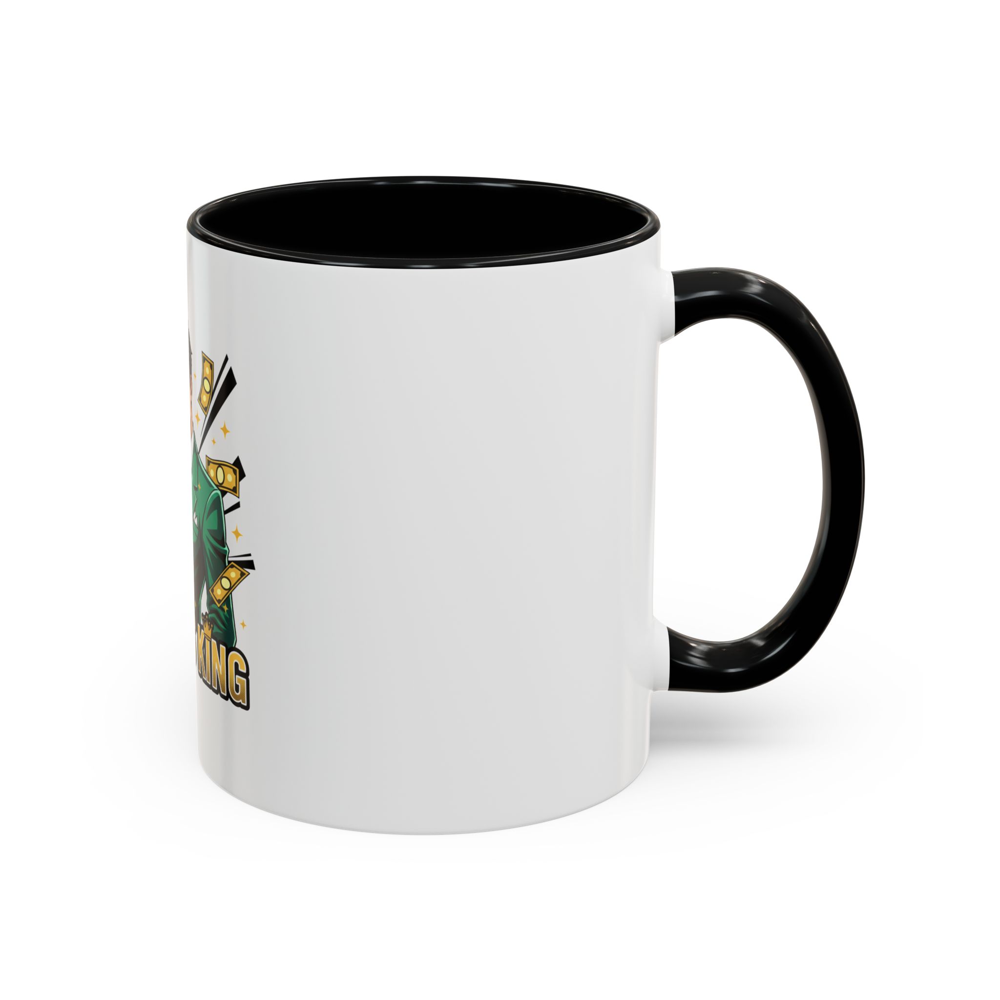 This glossy ceramic mug brings a playful, confident energy to your morning ritual. A sharply dressed character in a green suit tosses coins and cash in the air, while bold lettering declares “CASH IS KING.” The black interior and handle create a striking contrast with the white body, making the colorful artwork pop. Use it for your favorite brew, keep it on your desk as a conversation starter, or gift it to the friend who celebrates hustle and bold style. It feels cheeky and empowering—like a small, daily reminder to own your wins and savor the grind.