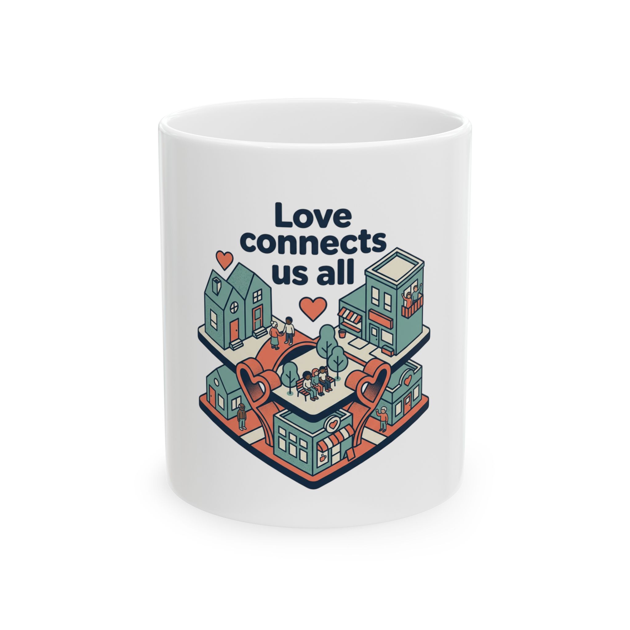 A glossy white ceramic mug illustrated with a warm, retro-style neighborhood scene and the message “Love connects us all.” Soft teal, coral, and cream tones wrap around tiny houses, a community garden, and heart-shaped pathways, creating a cozy, hopeful moment in every sip. The 11oz or 15oz size holds morning coffee or evening tea while the durable print stays vibrant through daily use. Comfortable C-handle and a shiny finish make this mug feel familiar in your hands — a small reminder to slow down, share stories, and celebrate the simple ties that bind a neighborhood together.