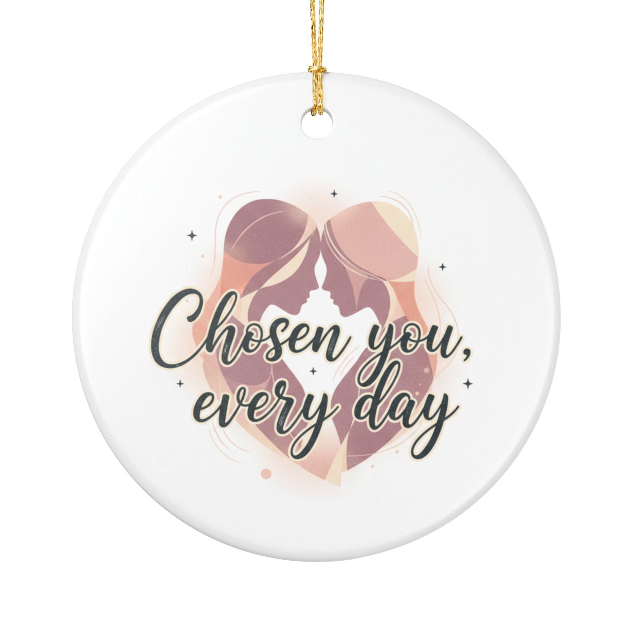 A delicate ceramic ornament that carries a soft, heartfelt message. Smooth, glossy white ceramic holds a matte-printed design on both sides — a warm, stylized heart with two figures and the phrase “Chosen you, every day.” A slim gold string is included for easy hanging. The ornament’s subtle palette and gentle lettering create a calm, intimate vibe that fits into quiet morning routines or evening reflections. Hung on a tree branch, in a window, or from a wall hook, it brings a small pause to notice someone you love. The lightweight, durable ceramic and UV-printed image keep the message clear and soft over time.