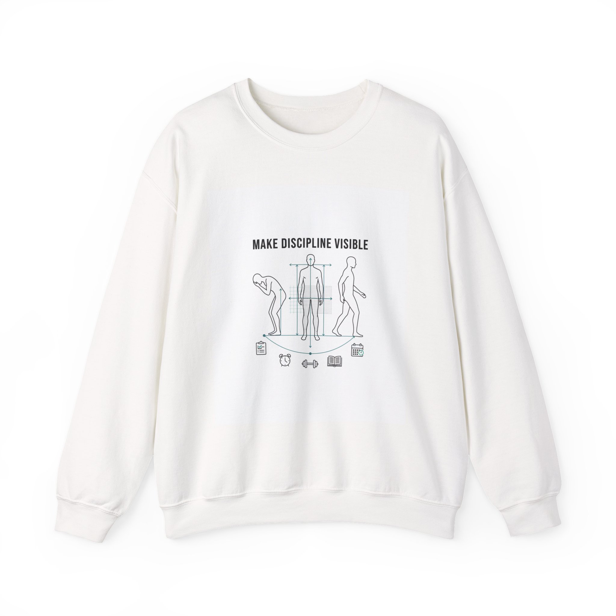 This crewneck sweatshirt carries quiet confidence. Soft, mid-weight fleece shapes a clean canvas for a minimalist line-art design that reads “MAKE DISCIPLINE VISIBLE.” The illustration charts movement and small ritual—stretching, standing tall, and focused steps—turning everyday actions into a visible practice. Wear it after morning routines, on slow studio days, or while stepping out for a short walk. It feels calm and purposeful against the skin, the collar and cuffs holding their shape through repeat wear. Subtle embroidery options make the piece feel personal—choose a small chest mark or wrists that nod to the message without shouting. Ethically-sourced cotton and OEKO-TEX dyes keep it responsibly made, so the garment supports both your habits and your values.