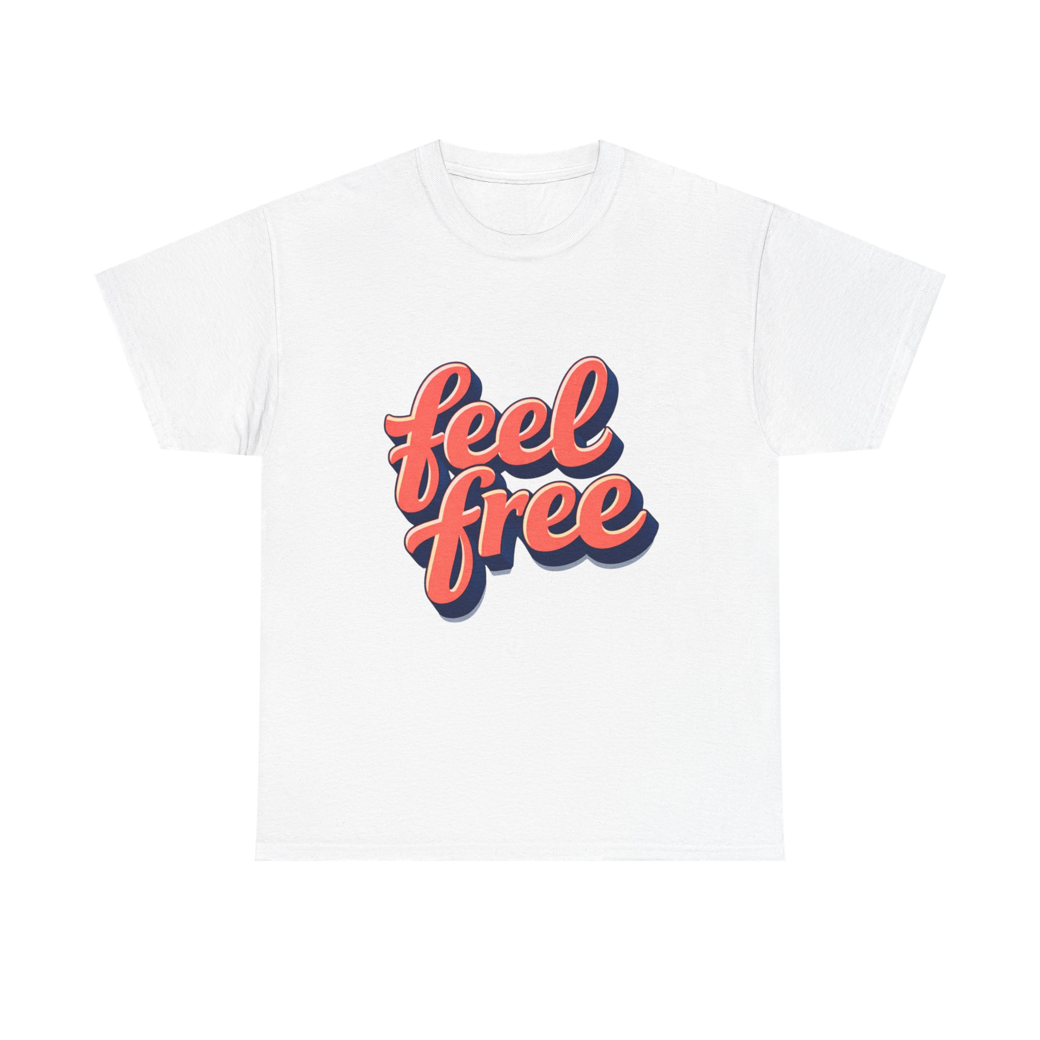 This tee carries a sunny, retro vibe — soft coral script with a subtle navy drop shadow that reads “feel free” and sits comfortably on the chest. It’s lightweight but sturdy, with a classic crew neck and relaxed silhouette that layers easily over a tank or under a denim jacket. Wear it on slow weekends, while wandering a sunny market, or when you need a quiet, confident reminder to breathe and move at your own pace. The smooth print pops against the clean white fabric, and the tear-away label and ribbed collar keep distractions to a minimum so the message — and your comfort — take center stage.