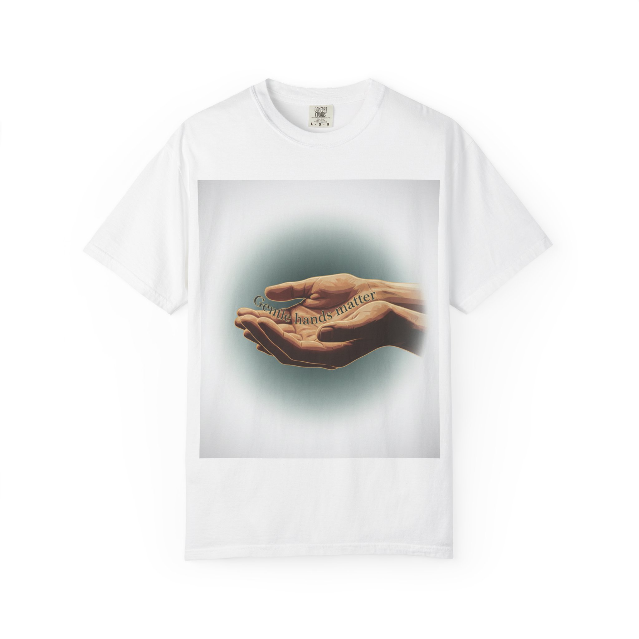 Soft, lived-in tee with a quiet, contemplative design. The garment-dyed cotton drapes gently, carrying a muted palette that feels like a morning ritual. On the chest, a pair of cupped hands holds a fragile script — intimate, thoughtful, like a line from a journal passed between friends. This relaxed-fit shirt moves with you: heavy enough to hold shape, yet softened by post-construction dyeing for that beloved break-in feel. Wear it to slow down — for coffee at sunrise, gallery visits, or long walks where words matter more than noise.
