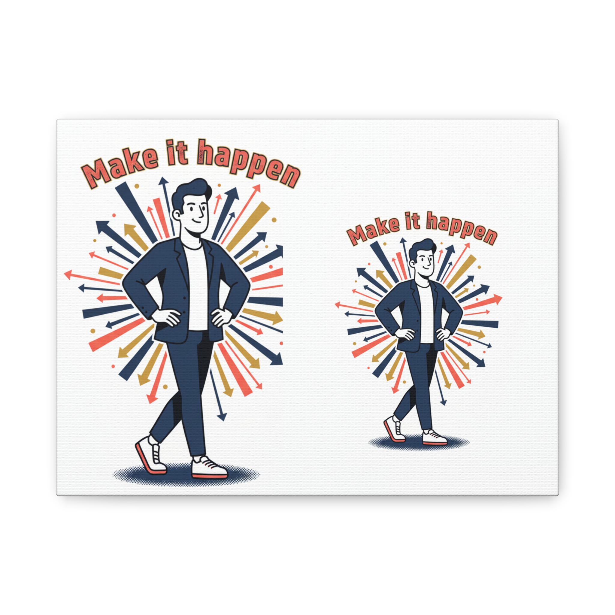 Light, confident, and a little playful — this matte stretched canvas brings an energetic reminder to keep moving forward. The illustration shows a casual, self-assured figure stepping out with hands on hips, set against a burst of colorful arrows and the upbeat line “Make it happen.” Hung above a desk or in a hallway, the print creates a quiet nudge toward momentum: small wins, steady strides, and the joy of progress. The matte finish keeps glare low and colors soft, while the slim 1.25″ stretcher frame gives a modern, gallery-ready profile that fits both home and office settings.