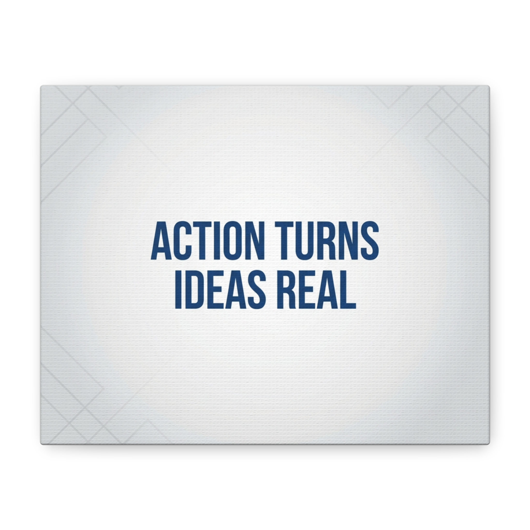 A clean, modern stretched canvas that quietly commands attention. The soft gray gradient and subtle geometric linework frame a bold, navy message: “ACTION TURNS IDEAS REAL.” It hangs flush to the wall with soft rubber stops, and the narrow 1.25″ profile gives a contemporary floating look. This canvas feels calm in a startup meeting room, focused in a home office, and encouraging in a creative studio—an understated visual nudge to move from thinking to doing.