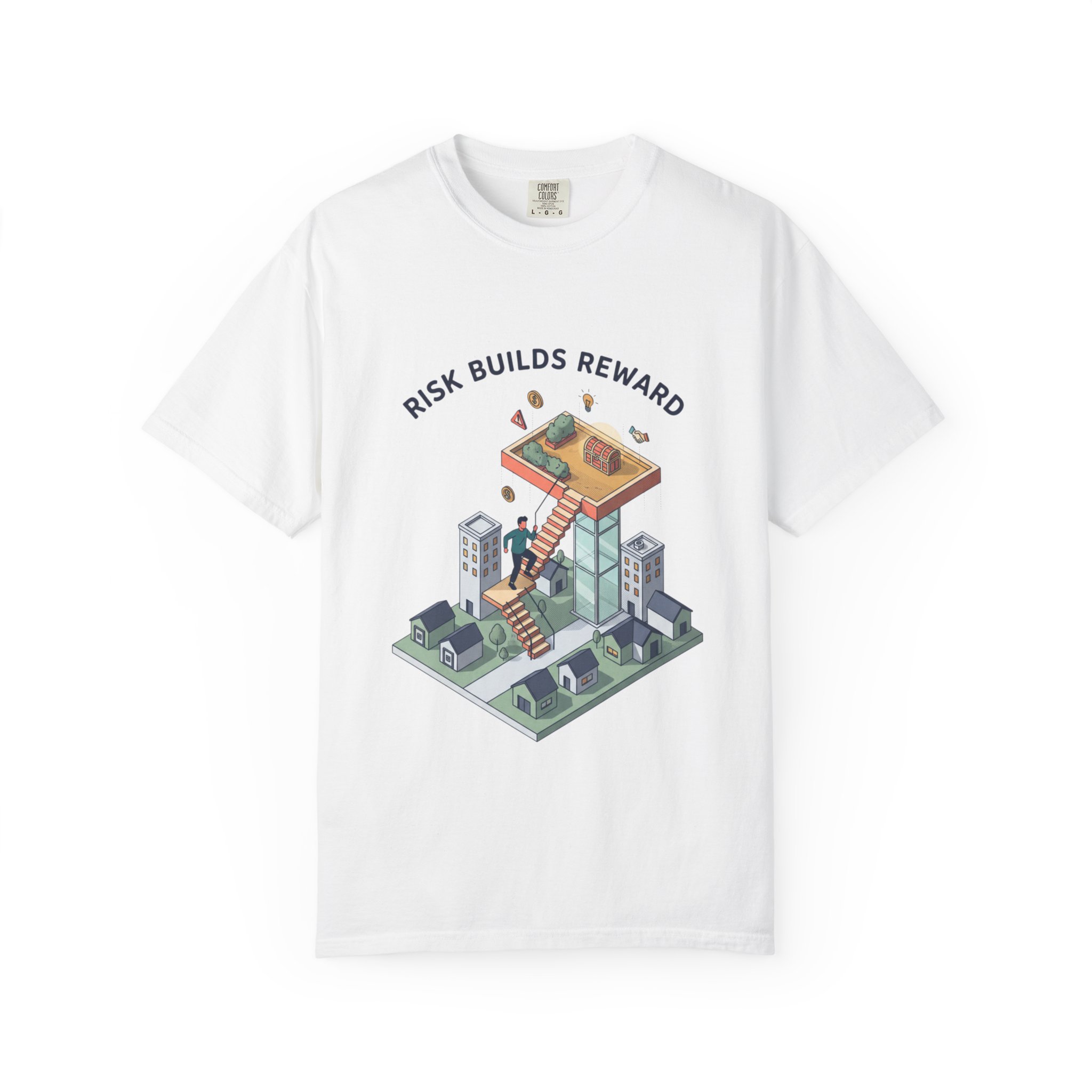 A soft, garment-dyed tee with a clean, modern illustration that speaks to builders, risk-takers, and people who celebrate upward motion. The illustration shows a small city block with a ladder leading up to a rooftop workspace and the words “RISK BUILDS REWARD,” giving the shirt a quiet, optimistic energy. Wear it when you’re sketching plans, meeting collaborators, or walking home after a long day of making. The heavyweight cotton and relaxed cut feel substantial without being stiff; the muted, washed-in color from the garment dye gives the print an integrated, lived-in look that pairs easily with jeans or a layered jacket.