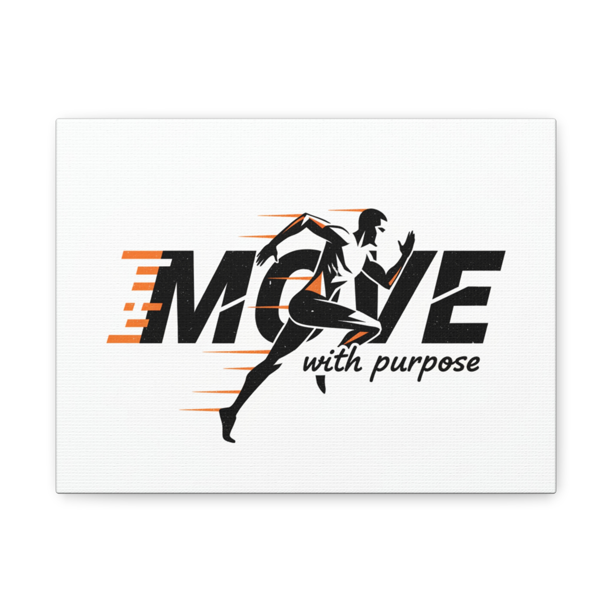 This stretched matte canvas brings energy and focus to any wall. Bold black and orange graphics—featuring a dynamic runner bursting through the word “MOVE” with the script tagline “with purpose”—feel like motion captured in stillness. The matte finish softens glare while preserving crisp detail, making the image readable from across a room without harsh reflection. Lightweight yet sturdy on a 1.25″ profile, the canvas sits slightly proud from the wall and adds a modern, athletic accent to home gyms, studios, office spaces, or training centers. It reads like a daily nudge: move with intention, train with heart.
