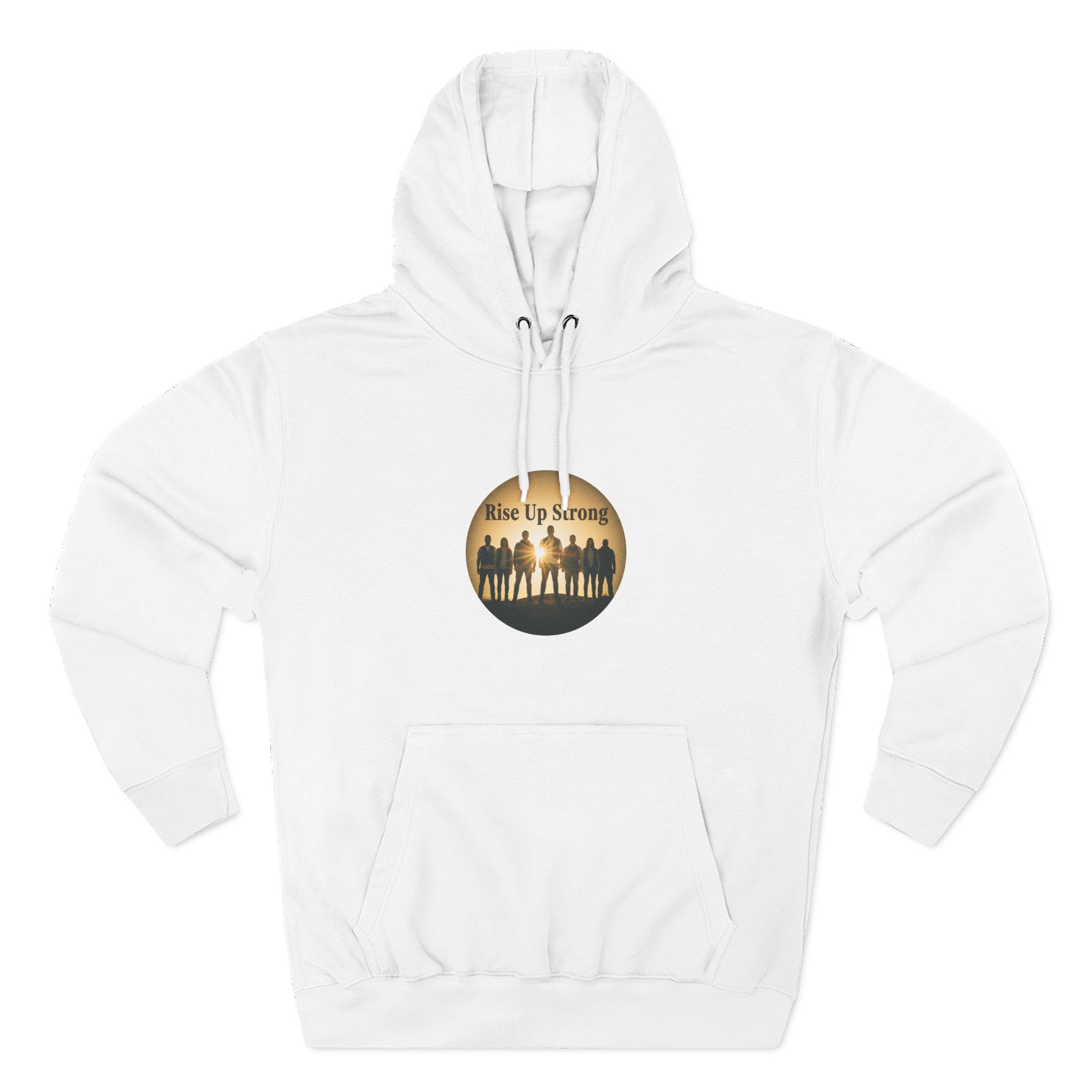 This midweight hoodie brings a quiet, confident energy to everyday wear. The clean white canvas puts the warm, sunset-hued circular graphic front and center — silhouettes rising together beneath the words “Rise Up Strong.” The soft 3-end fleece and combed ring-spun cotton blend feel gentle against skin while the roomy kangaroo pocket and adjustable hood add practical comfort. Subtle, durable details like twill neck tape, double-needle topstitching, and a tear-away label keep the silhouette neat through repeated wear. Wear it on early morning walks, community meetups, or when you want a low-key reminder of solidarity and resilience.