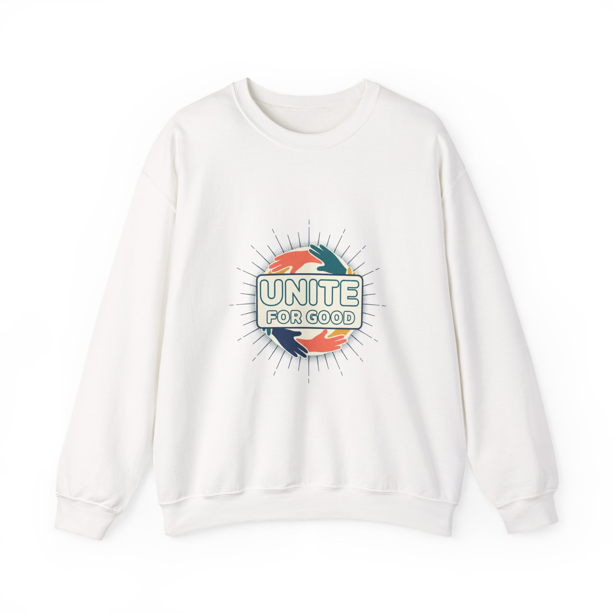 Soft, warm, and quietly powerful — this crewneck sweatshirt wraps you in comfort while carrying a message. A sunburst emblem and two hands encircle the words “Unite for Good,” printed on a clean white canvas. Wear it on cool mornings or layered for evening gatherings; the design reads like a hopeful handshake across differences, effortless and sincere. The medium-heavy cotton blend feels substantial without being stiff, and the ribbed collar and cuffs hold their shape through repeated wear. This sweatshirt moves easily from neighborhood walks to community meetups, making the statement without shouting it.