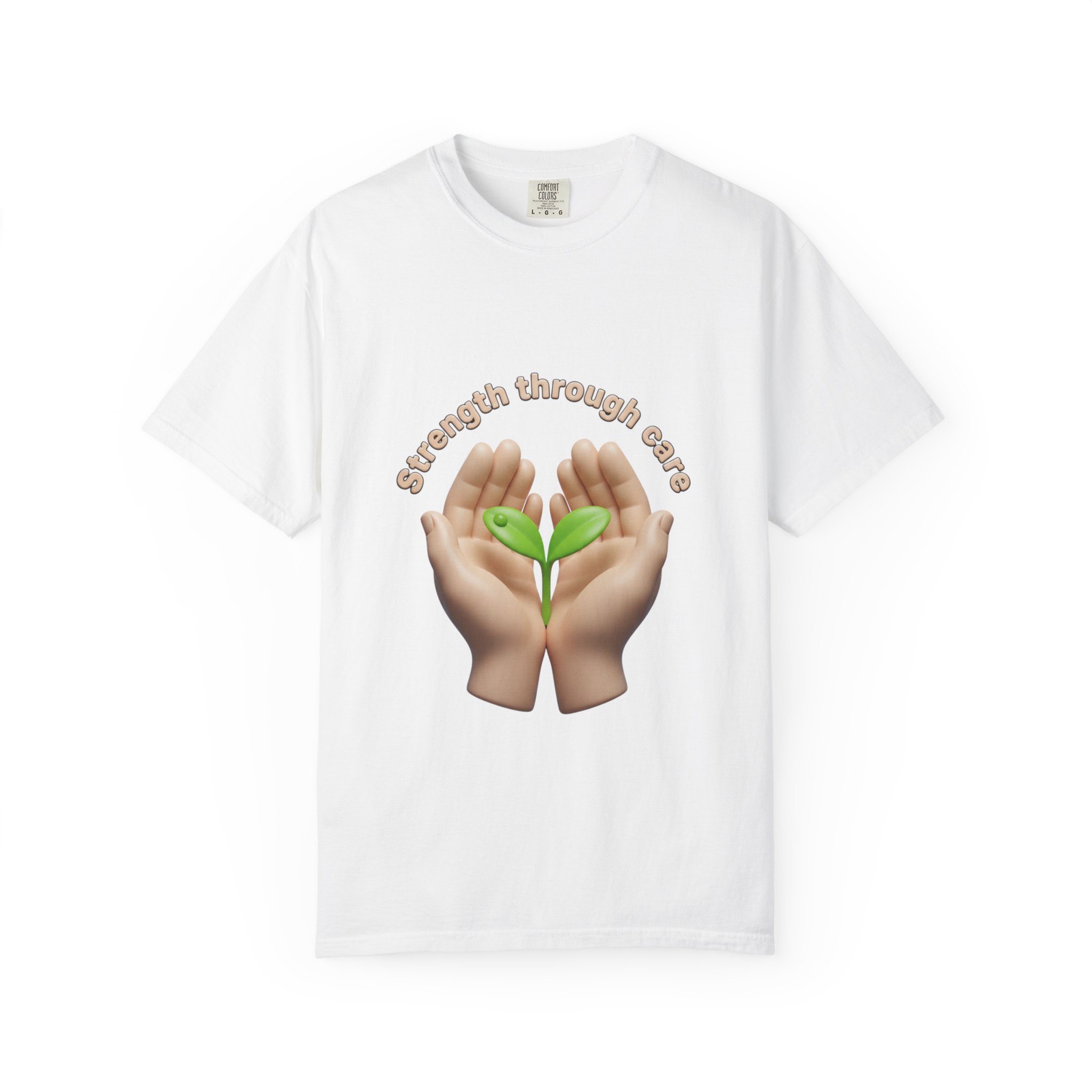 A soft, heavyweight tee dyed after construction for a lived-in look and feel. This relaxed-fit shirt carries a gentle graphic of cupped hands cradling a young sprout with the words “strength through care” arched above — a quiet reminder to nurture growth, inside and out. The tubular knit and pre-shrunk ring-spun cotton give a sturdy yet comfortable drape that works equally well layered under a jacket or worn solo on slow weekends. Available in many colors and sizes, it ages gracefully with every wash, gaining softness and character.