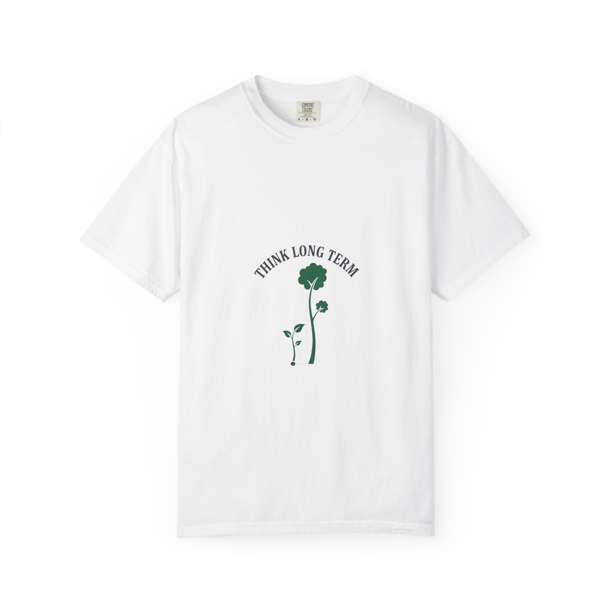 Soft, lived-in tee with a quiet message: a simple green floral sketch sits at the chest beneath the words “Think Long Term.” The garment-dyed cotton feels broken-in from day one, with a relaxed silhouette that drapes easy over layers or stands alone on warm afternoons. Wear it on walks through the neighborhood, to community meetings, or while tending a small balcony garden — it’s for people who care about slow change and subtle reminders. The printed art is small and unassuming, letting the fabric’s texture and gentle color do the talking. Sized from S to 4XL and available in many muted tones, this shirt becomes part of a calm, sustainable-minded wardrobe and keeps its shape thanks to double-needle seams and pre-shrunk heavyweight cotton.
