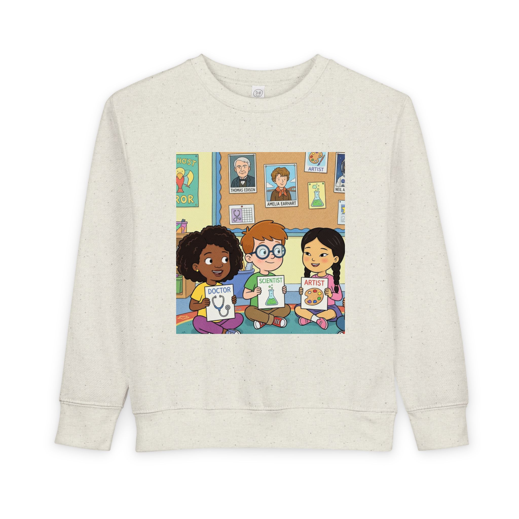 A soft, cozy toddler sweatshirt that brings classroom joy to playtime. The cheerful illustration of three kids sharing books and art sparks curiosity and invites conversation—perfect for story hour, preschool mornings, or quiet afternoons at home. The medium-weight fabric holds up to active play while feeling gentle on little skin. Subtle heather tones and neat coverstitching give the sweatshirt a lived-in, loved look that layers easily under jackets or pairs with play pants. Let this sweatshirt be the one your child reaches for when they want comfort and a little extra imagination.