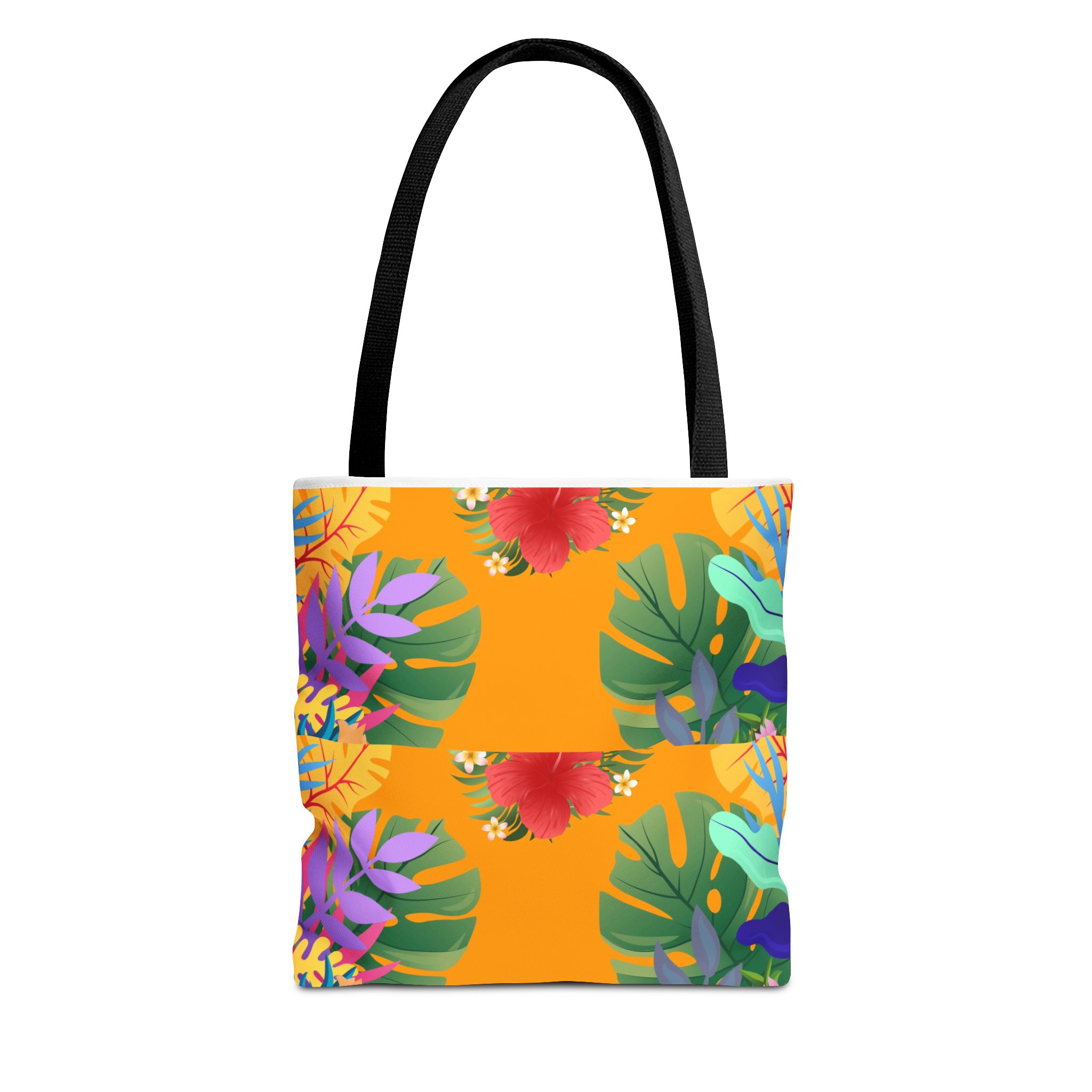 Bright, roomy, and made to travel with you — this printed tote blends bold tropical color with smart everyday construction. Lush monstera leaves and hibiscus blooms float across a warm orange field, adding a cheerful, sunlit energy to errands, market runs, or beach days. The durable polyester body keeps the design crisp and resists wrinkling and dampness, while boxed corners add volume so groceries, a water bottle, or a beach towel sit neatly inside. Reinforced handle stitching and a laminated interior mean this tote stands up to daily wear without losing its shape. Choose a handle color to match your look and carry a little summer wherever you go.