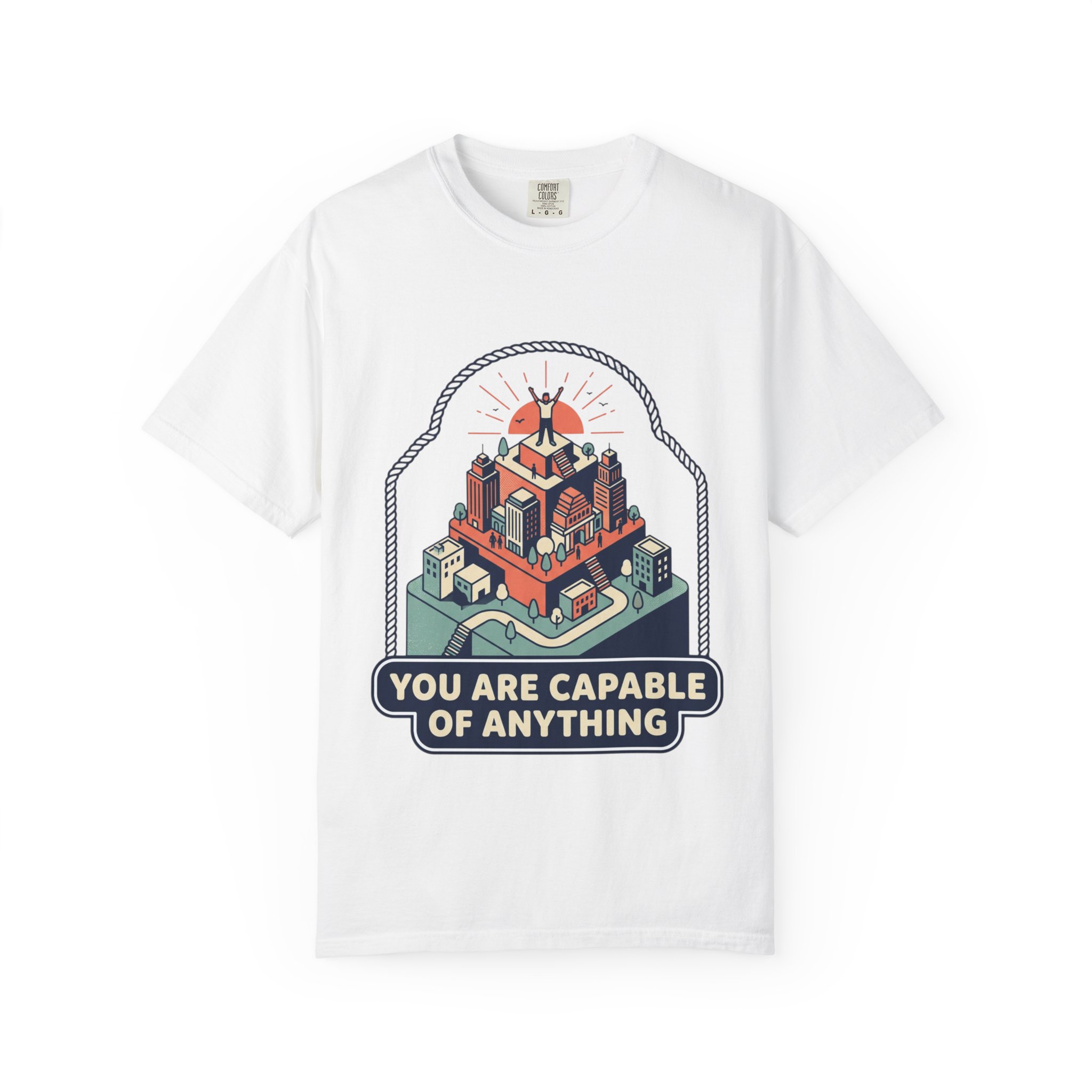 This heavyweight garment-dyed tee brings quiet confidence to everyday wear. A bold, isometric illustration crowns the chest with a tiny cityscape and sunburst, anchored by the phrase “You are capable of anything.” The soft-dyed cotton and relaxed cut make it feel worn-in from day one, while durable double-needle stitching and a tubular knit keep the silhouette clean and long-lasting. Wear it to steady your morning routine, layer it under a jacket for evening walks through the neighborhood, or pack it for a weekend retreat — it’s built to move with you and age beautifully.